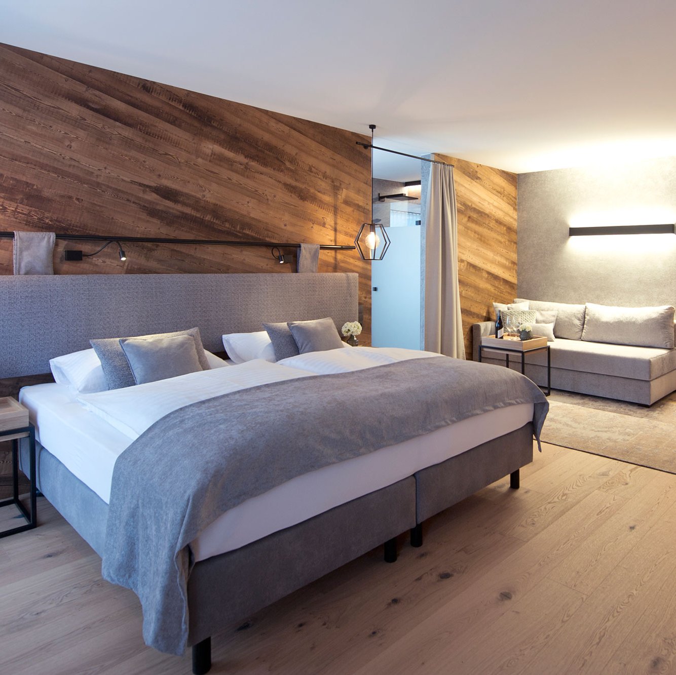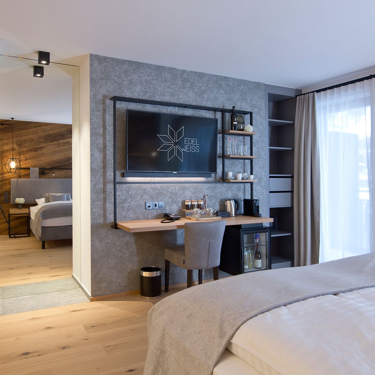 Es scheint, als bliebe in der EDELWEISS Suite kein Wunsch nach Raum und Behaglichkeit offen. Hier erwartet Sie eine perfekte Ausgewogenheit zwischen österreichischer Gemütlichkeit und funktionellem Komfort. In diesem Traum aus alpinem Design haben Sie garantiert kein Platzproblem. Dafür sorgen die 2 separaten Schlafzimmer, die beide über einen Flat-TV verfügen, und ein Badezimmer mit freistehender Badewanne im Panoramaerker und zusätzlicher Dusche. Das i-Tüpfelchen der EDELWEISS Suite sind die beiden großen Balkone mit herrlicher Rundumsicht auf die heimische Bergwelt.